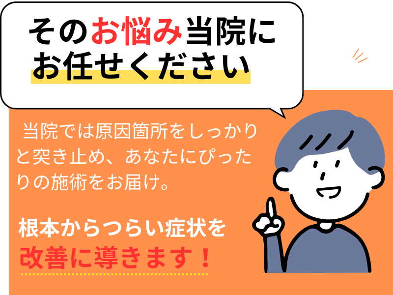 また頭痛やめまい、慢性肩こり、逆流性胃腸炎、下痢などの自律神経の症状に対応するメニューもあり、こちらは神経から改善を図ります。症状に合わせて多角的にアプローチを行うことでお身体全体の調子をアップしていきます。