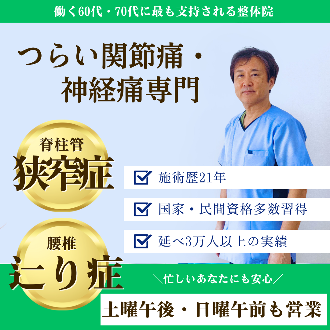 脊柱管狭窄症はいろいろな運動器疾患の中でも極めて改善するのが難しいとされています。年齢的な問題で骨や神経の器質的変化がレントゲンやMRIでさらけ出されてしまうと、選択肢が一気に「手術」に絞られてしまいますよね。