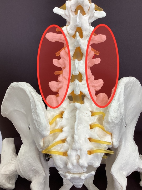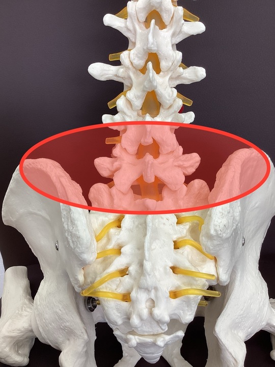 すべり症は、腰椎がお腹側に滑った状態を指し、反り腰のように腰骨を触るとへこんでいます。