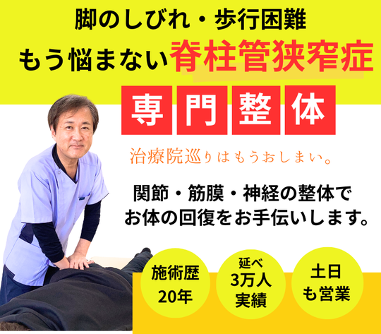 ただし、画像で脊柱管狭窄症と診断されても、原因はほかにある方も決して少なくありません。立ち仕事や体を酷使する方などは、骨盤の横に着く小殿筋という筋肉が体のバランスを取る際に過剰に働いて炎症を起こし、股関節あたりからももの外側や裏側、すねの外側にかけて関連痛を引き起こします。また、長い時間横向きで寝たりテレビを見る方などは筋膜が圧迫されることにより浅筋膜や深筋膜を通る細い神経や血管が滑走不全を起こしてしびれを誘発すことも珍しくありません。