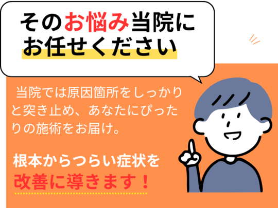 いずれにしても、仕事中や普段の生活での姿勢が大きく関係していて、姿勢が改善できれば比較的痛みやしびれも取れやすくなります。