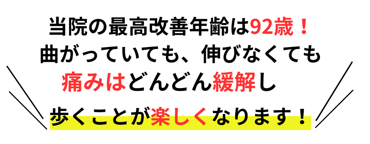 最初は年齢のことと脚の形で改善は難しいかもと考えていましたが、当院で行っているひざ関節矯正を実施。すると回を重ねるごとに痛みが引いていき、ある日施術が終わると一目散に当院の隣にあるコンビニまでスタスタ歩いて行かれるではないですか!