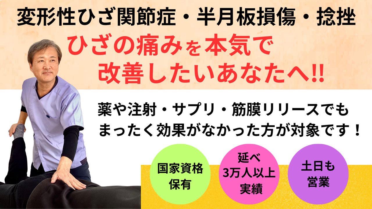 ひざ関節は一度悪くなると、進行が進みやすい場所なので、すごく悪くなってしまう前に早めの施術をおススメします。