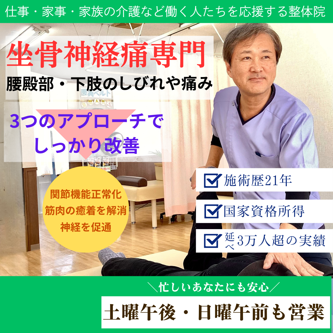 イスなどの前に座ると、角がお尻に食い込んで坐骨神経を圧迫します。この時間が長時間続くと痛みやしびれが出やすくなり、それが何年も習慣化すると神経に傷がついてしまします(意外とこのような座り方をしている方は多いです)。