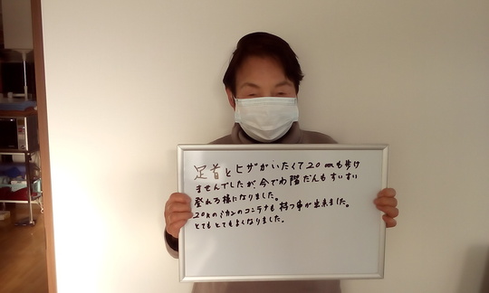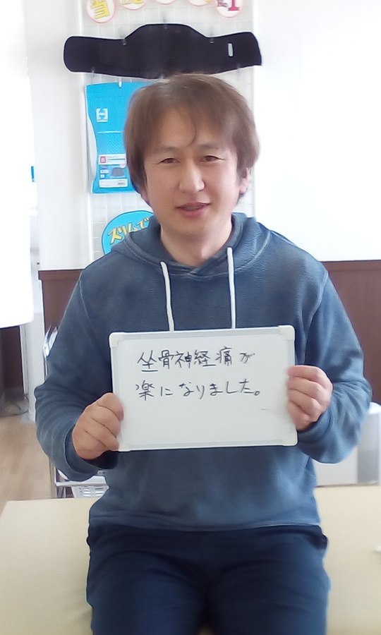 腰の痛みは数回の治療で良くなりましたが、もものしびれはお仕事上どうしても長時間座らなければいけないため、すぐには改善んしませんでした。それでも10回ほどで変化が出始め、12回目にはほぼ消失。お仕事もとても楽になったと喜んでおられました。