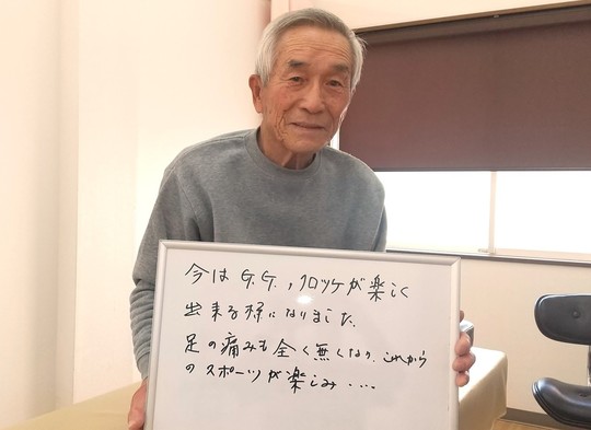 施術は序盤はなかなか改善しませんでしたが、ある日突如として痛みが消失。座っていてもまったく痛みを感じないまでに回復されました。施術を重ね、患者さんの細胞の傷を修復したり新陳代謝が活発になると自然治癒力が活性化。「良くなるスイッチ」さえこちらが押してしまえば、勝手によくなるというお手本みたいな患者さんでした。今では、グランドゴルフのボールが飛びすぎて困っているそうです(^^♪。