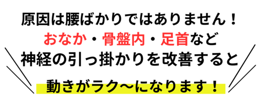 さらに脊髄神経後外側枝という神経が硬くなった胸腰筋膜につかまれて痛みや下肢へのしびれを出しているケースも珍しくありません。