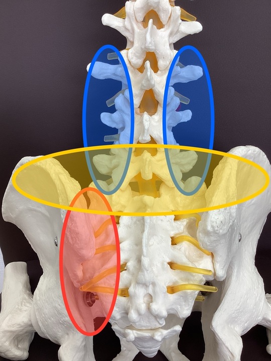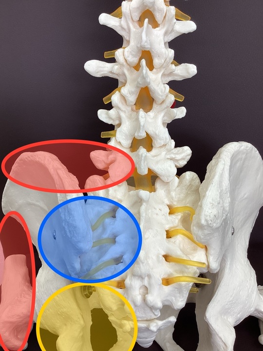 そして、赤色の部分にあるのが仙腸関節というとても大切な関節です。上半身と下半身の重みをここで支えているため、一度ずれたり動きが妨げられたりすると強い痛みを発します。