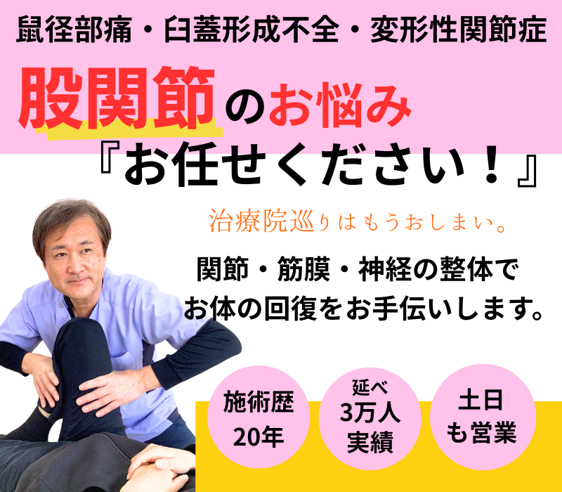股関節の前面、鼠径部の痛みが変形性股関節症の代表的な部位になります。ただ、画像診断で股関節が変形しているのが原因と診断された方でも、股関節を動かす筋肉同士の癒着や神経との癒着をはがし、神経に反射を起こして筋肉が正常な動きを取り戻すと、痛みが激減する方も多数おられます。